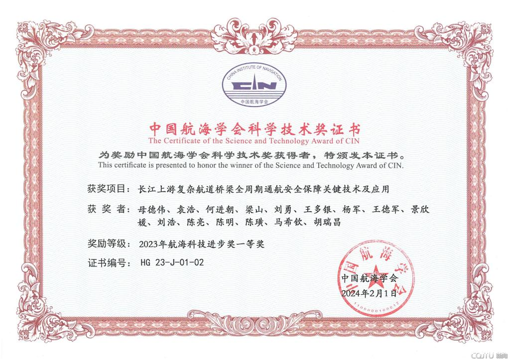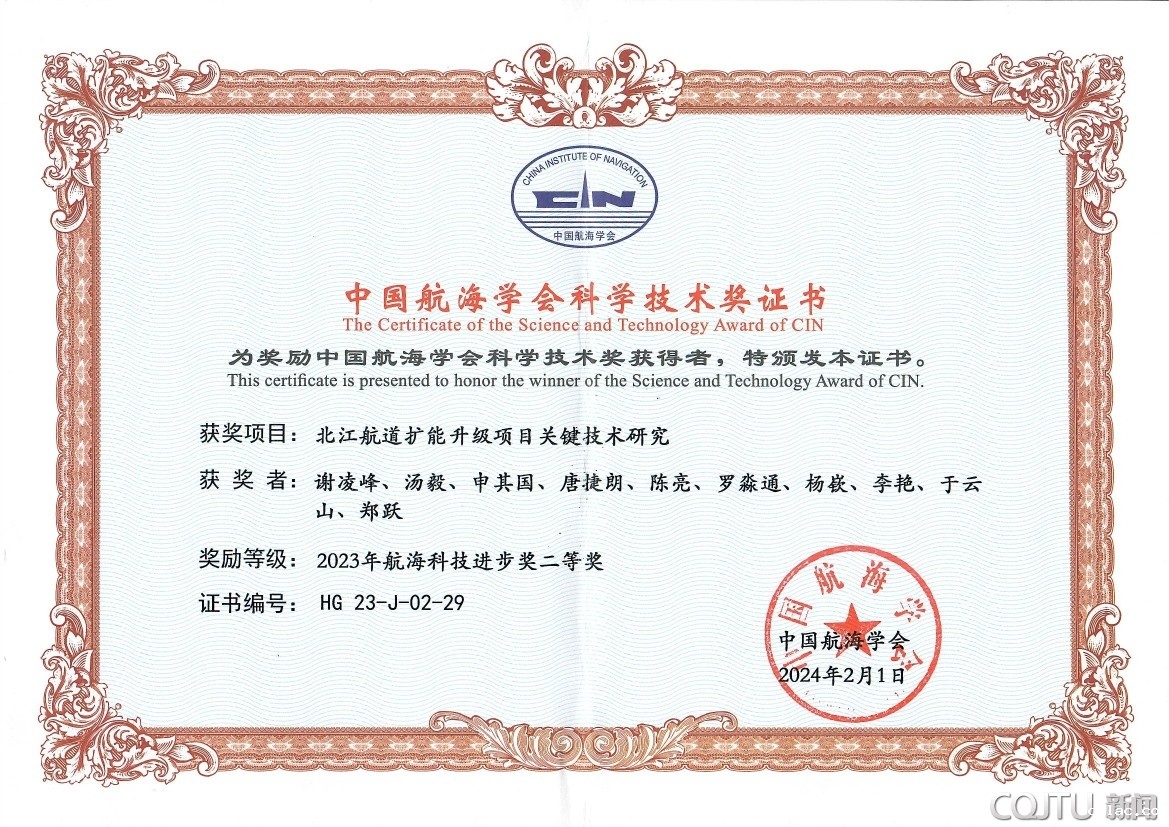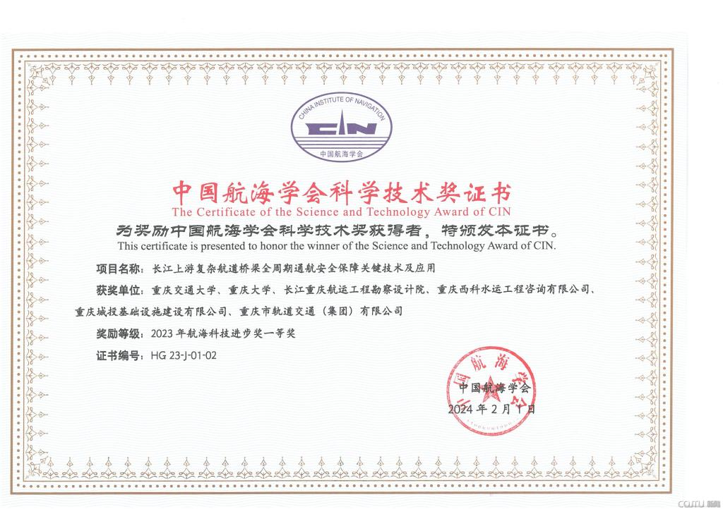 由老伟德网上娱乐牵头,西科公司执行董事母德伟作为第一完成人的“长江上游复杂航道桥梁全周期通航安全保障关键技术及应用”项目获中国航海学会2023年度科学技术奖一等奖。西科公司陈亮等人参与的“北江航道扩能升级项目关键技术研究”项目获中国航海学会2023年度科学技术奖二等奖。