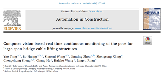 2024年3月,土木工程学院2021级硕士研究生唐尧(指导老师:黄博)在土木工程智能建造领域的国际顶级期刊《Automation in Construction》(影响因子:10.3,工程领域期刊CiteScore排名:4/350)发表题为《Computer vision-based real-time continuous monitoring of the pose for large-span bridge cable lifting structures》的研究论文。