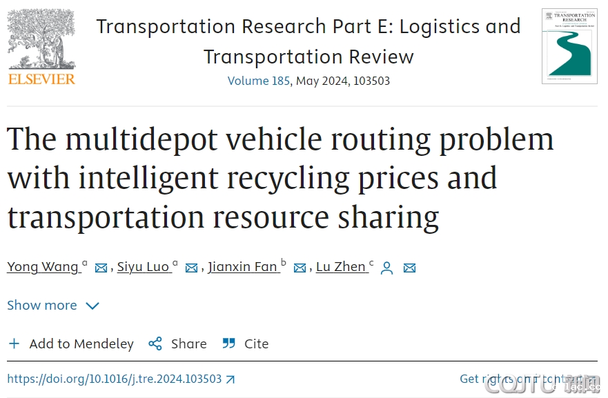 2024年3月,经济与管理学院王勇教授与指导的博士研究生罗思妤合作在国际权威期刊《Transportation Research Part E》(影响因子:10.6,中科院1区TOP期刊)上发表题为《The multidepot vehicle routing problem with intelligent recycling prices and transportation resource sharing》的研究论文。