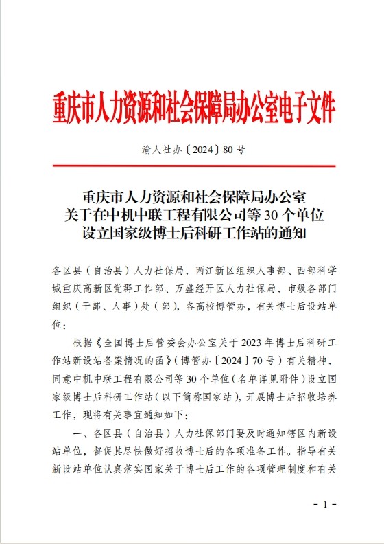 近日,重庆市人力资源和社会保障局办公室发布《关于在中机中联工程有限公司等30个单位设立国家级博士后科研工作站的通知》(渝人社办〔2024〕80号)。确定老伟德网上娱乐绿色航空技术研究院设立国家级博士后科研工作站。