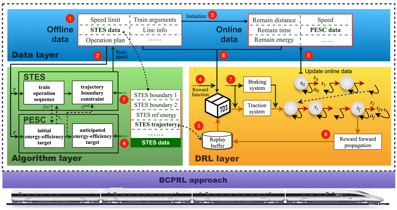 在基于深度强化学习的高速列车智能控制中,存在高时间变异性的状态空间表征约束、非线性增长的动态能效奖励函数设计机理尚不明晰等关键科学问题,论文创新性地提出了一种边界约束和预评估的深度强化学习(BCPRL)方法。在高速列车运营环境下,所提方法揭示了常用固定奖励函数在不同约束条件下的局限性,结合收缩轨迹探索空间、预评估能效情景复杂性,以及双延迟深度确定性策略梯度,优化了列车的智能决策控制策略,有效提升了高速列车的能源效率和运营质量,为高速列车智能控制提供了坚实的理论基础。