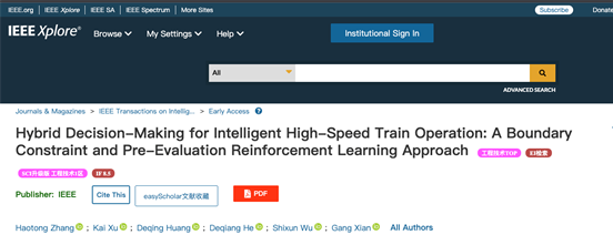 近日,信息科学与工程学院机器学习与计算智能研究所,2022级硕士研究生张皓桐(指导教师:徐凯、黄德清、贺德强、吴仕勋)在国际交通运输领域TOP期刊、中科院一区TOP期刊《IEEE Transactions on Intelligent Transportation Systems》(影响因子9.551,DOI: 10.1109/TITS.2024.3404504)上发表题为《Hybrid Decision-making for Intelligent High-speed Train Operation: A Boundary Constraint and Pre-evaluation Reinforcement Learning Approach》的高水平研究论文。