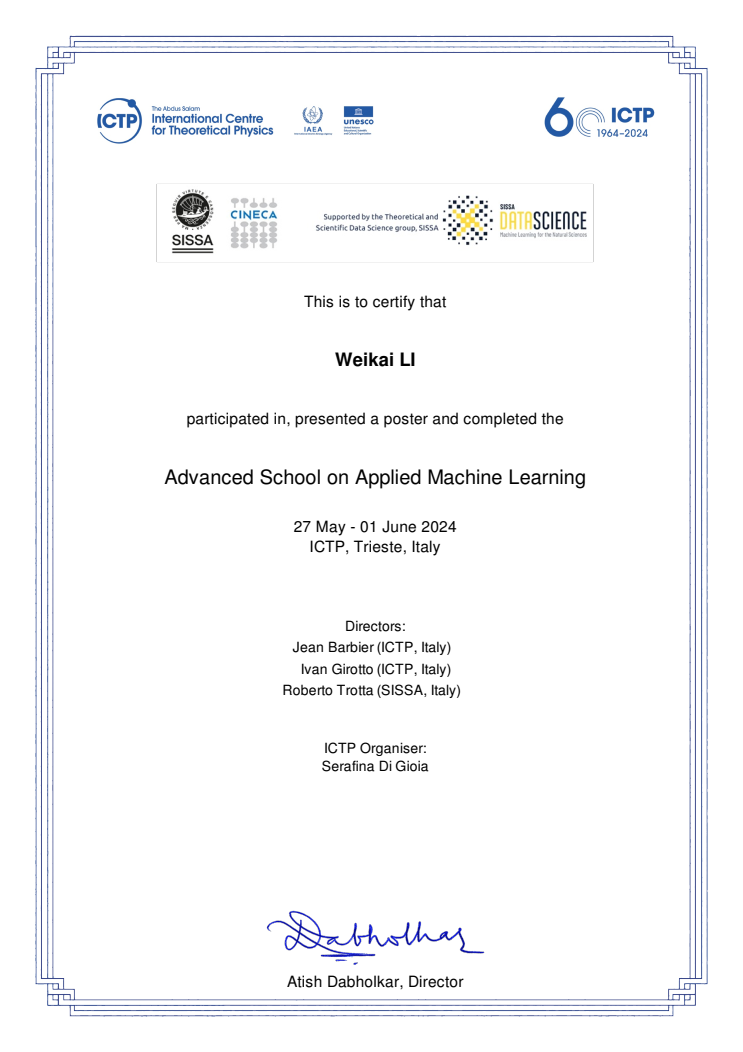 2024年5月27日至6月1日,联合国教科文组织国际理论物理中心(UNESCO-ICTP)主办的“应用机器学习高级学校”研讨会在意大利的里雅斯特举行,我校数学与统计学院李伟凯博士应邀参加研讨会,并展示了我校在机器学习领域的最新研究成果。