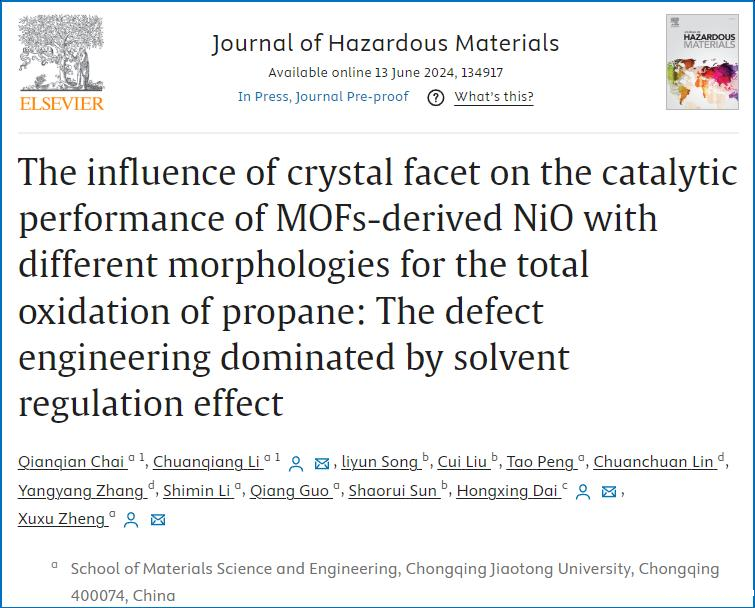 近期,材料科学与工程学院科研团队在国际期刊《Journal of Hazardous Materials》上发表了题为“The influence of crystal facet on the catalytic performance of MOFs-derived NiO with different morphologies for the total oxidation of propane: The defect engineering dominated by solvent regulation effect”的科技论文。《Journal of Hazardous Materials》为材料领域顶级期刊(SCI一区,TOP),影响因子13.6。该论文的第一作者为材料学院在读硕士研究生柴倩倩,通讯作者为我校郑旭煦教授和李传强教授。