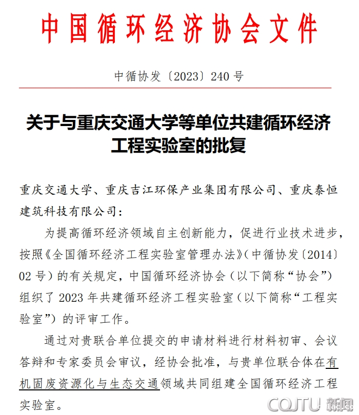 2024年6月12-14日,由中国循环经济协会主办的“2024全国循环经济科技创新工作会议”在浙江杭州召开。会议期间,协会就“2023年度共建循环经济工程实验室依托单位”进行了授牌。我校获批“有机固废资源化与生态交通全国循环经济工程实验室”,成为重庆市目前唯一一家获得该工程实验室的牵头单位。材料学院关伟教授代表学校参加了授牌仪式。