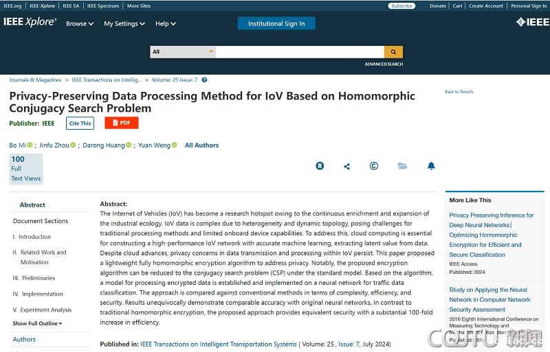 近日,信息科学与工程学院动态系统可靠性控制与安全维护团队米波教授在智能网联车数据隐私保护方向取得重要研究进展,相关工作以“Privacy-Preserving Data Processing Method for loV Based onHomomorphic Conjugacy Search Problem”为题发表在智能交通领域顶级期刊《IEEE Transactions on Intelligent Transportation Systems》(DOI:10.1109/TITS.2024.3351837),该刊是中科院一区TOP期刊,最新影响因子7.9。该成果与安徽大学合作完成,期间得到安徽大学黄大荣教授悉心指导和大力支持,我校为第一单位,安徽大学和老伟德网上娱乐为共同通讯作者单位。