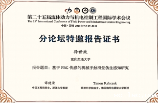 会议期间,孙世政教授以“基于FBG传感的机械手触滑觉仿生感知研究”为主题,围绕触滑觉仿生感知研究的关键问题、感知机理、模型构建、样机研制、信号特征辨识与解耦等方面内容作了特邀报告,介绍了研究工作的最新成果,交流了创新内容与思想,得到了与会专家学者的高度评价和认可。
