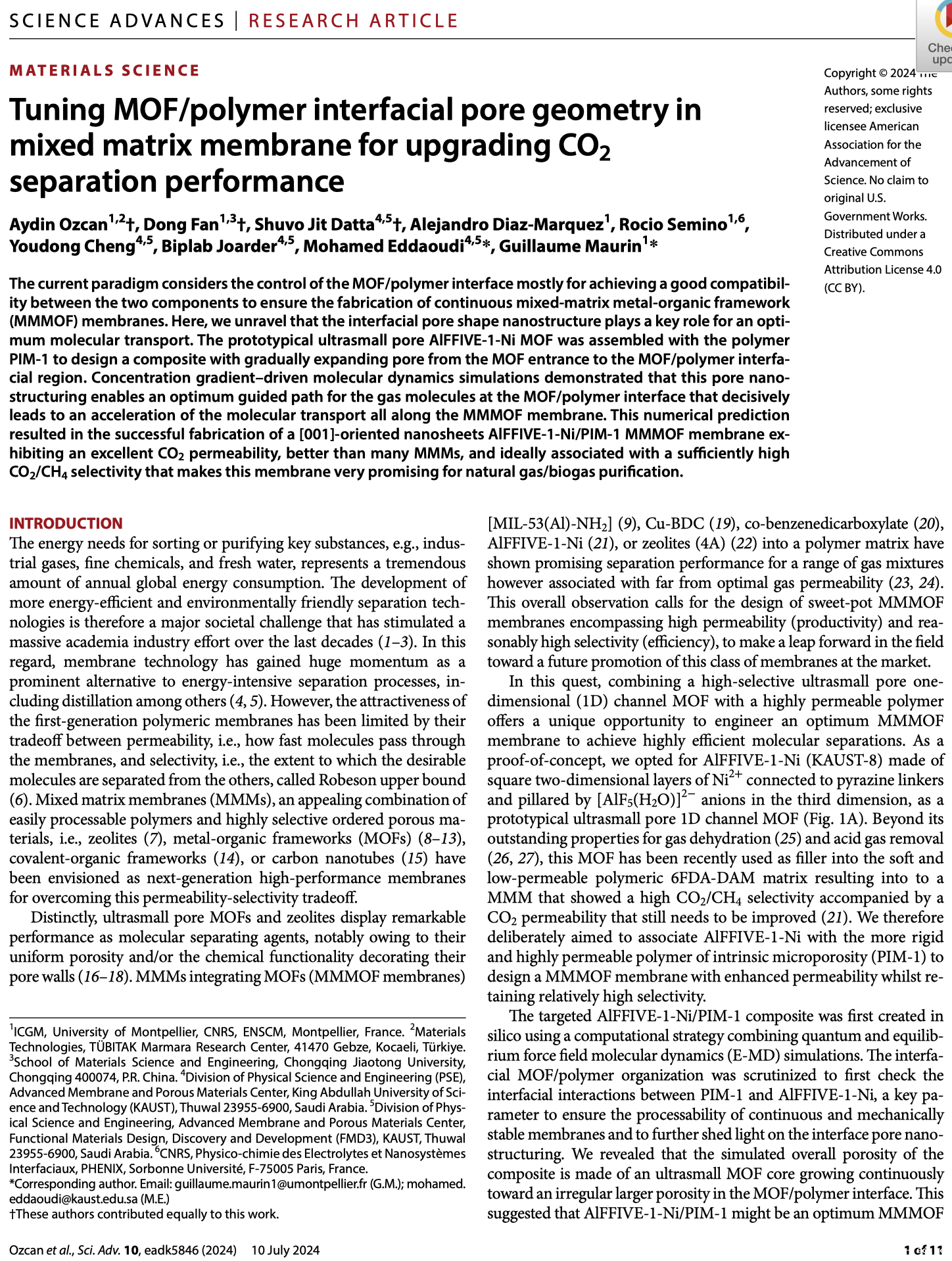 近日,材料科学与工程学院青年教师樊冬博士以共同第一作者身份在国际顶级综合性期刊《Science Advances》期刊发表题为Tuning MOF/polymer interfacial pore geometry in mixed matrix membrane for upgrading CO2separation performance的研究论文(论文链接:https://doi.org/10.1126/sciadv.adk5846)。论文通讯作者为法兰西大学研究院院士Guillaume Maurin教授和阿卜杜拉国王科技大学先进膜及多孔材料研究中心主任Mohamed Eddaoudi教授,老伟德网上娱乐材料科学与工程学院为共同完成单位。