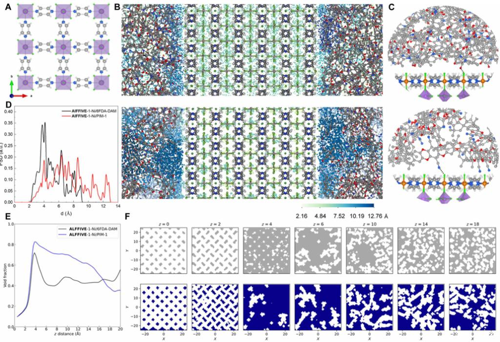 这项工作采用了多尺度的计算模拟和实验验证相结合的方法,从原子尺度到膜性能,系统地研究了2种不同MOF/聚合物界面结构对气体分离性能的影响,为开发高性能复合膜提供了新的设计原则。首先通过第一性原理计算和大规模分子动力学模拟,构建了AlFFIVE-1-Ni/PIM-1和AlFFIVE-1-Ni/6FDA-DAM两种复合膜的原子尺度模型。随后采用非平衡分子动力学模拟,系统性的研究了CO2在这两种复合膜界面孔隙结构中的传输动力学。最后预测AlFFIVE-1-Ni/PIM-1复合膜界面具有更优的CO2渗透性能。最后,实验合作者根据计算预测,成功制备了高质量[001]取向的AlFFIVE-1-Ni/PIM-1复合膜,并证实其具有优异的CO2渗透性能和良好的CO2/CH4选择性。