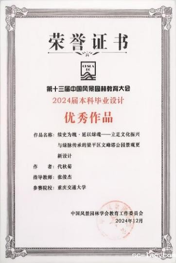 在大会颁奖环节,我校风景园林专业学生代秋菊荣获本届风景园林教育大会优秀本科毕业设计作品奖。她的作品《续史为魄·延以绿魂》以文化振兴和绿脉传承为主线,对重庆梁平区文峰塔公园进行景观更新设计,作品在创新性、实践性和文化传承方面特色突出,得到了组委会的一致认可。同时,张俊杰老师也获得了本届毕业设计优秀指导教师。