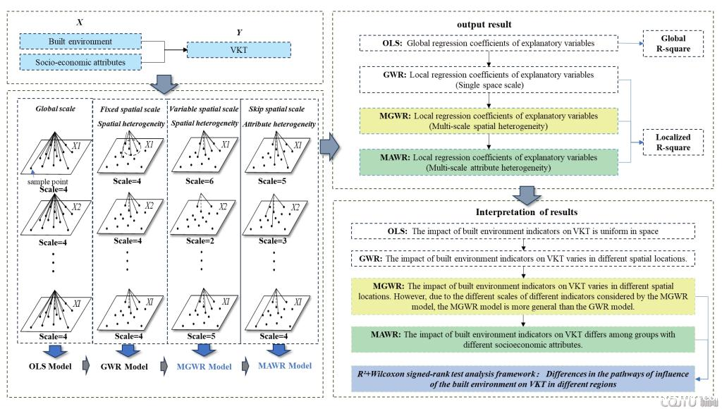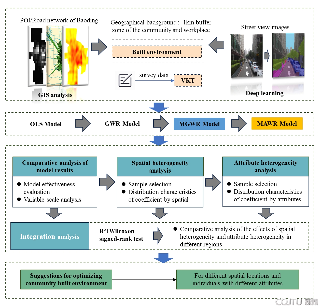 在社区生活圈建设与“双碳”背景下,为推动绿色低碳出行、优化社区出行环境,研究以河北保定市为案例,深入探讨了社区建成环境对机动车出行距离(VKT)的影响机理。在已有研究普遍单一空间异质性问题的基础上,本研究结合社会互动、生命周期等理论,创新性的提出不同建成环境要素对VKT的影响存在空间和群体的“二元异质性”,而忽视这一情况可能会导致社区绿色出行建成环境优化策略效果不佳。为此,研究一方面引入了多尺度地理加权回归模型(MGWR),以识别不同变量在空间上的异质性影响特征,另一方面提出了多尺度属性加权回归模型(MAWR),从群体社会经济特征维度分析个体行为差异。最后,构建了一个空间异质性与群体异质性的整合空间分析框架。研究发现,不同建成环境因素对VKT的影响程度及作用范围在空间与群体层面存在显著差异,政策设计需要结合异质性的具体表征进行针对性设计。研究结果对推动“以人为本”“绿色出行”的城市更新和精细化空间治理具有重要意义。