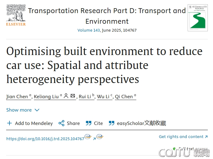 2025年4月,交通运输学院陈坚教授与博士研究生刘柯良在交通环境领域国际权威期刊《Transportation Research Part D: Transport and Environment》(中科院1区TOP期刊,影响因子:7.3)上发表题为《Optimising built environment to reduce car use: Spatial and attribute heterogeneity perspectives 》的研究论文。
