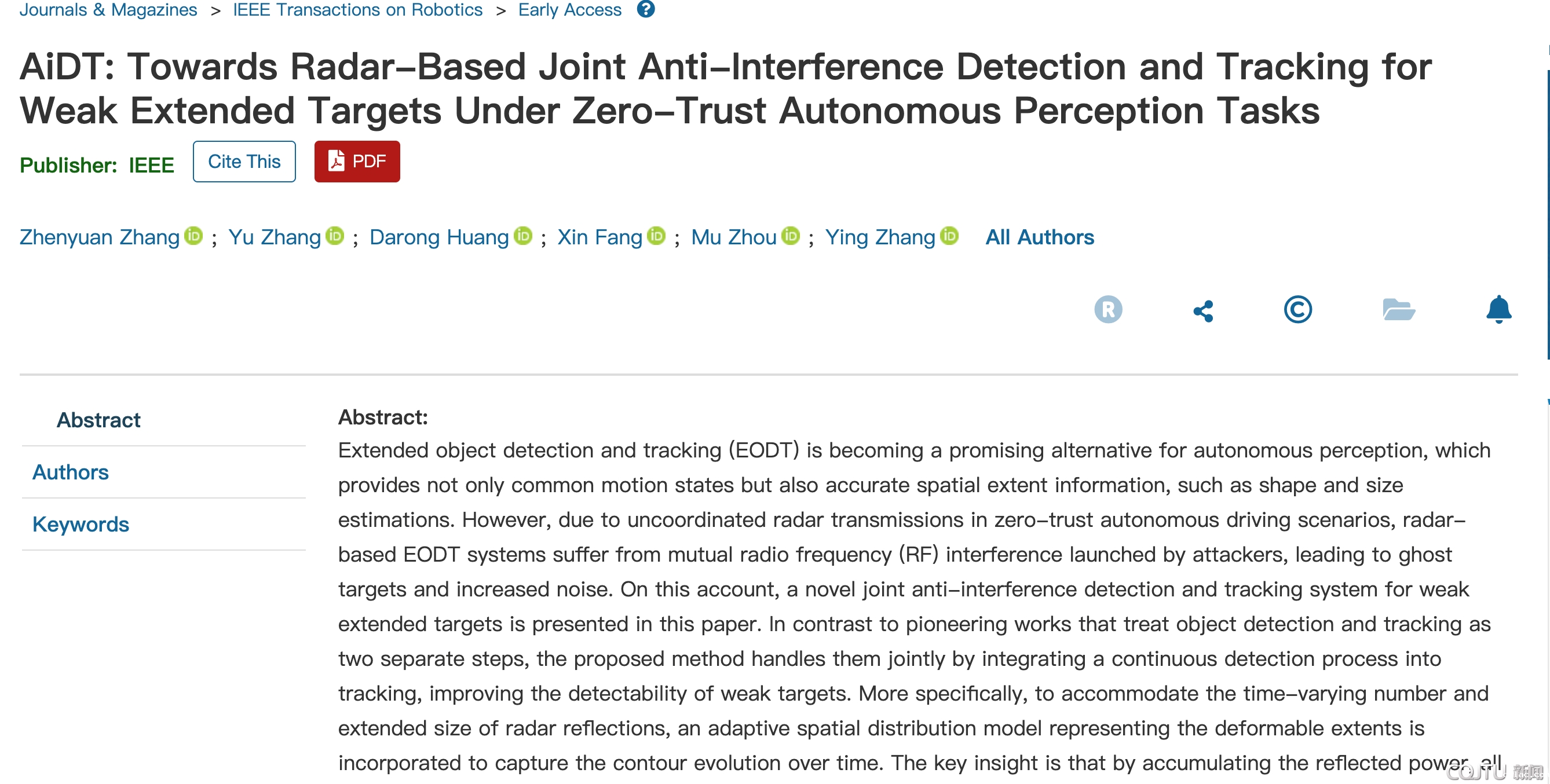 在智慧交通安全问题得到重视的背景下,围绕我校自主式交通装备安全管控重点研究方向,交通运输学院教师张振源副教授针对城市高密度车流场景中车载毫米波雷达遭遇射频干扰攻击,导致道路运动目标感知结果失效的问题,系统研究了车载毫米波雷达在非完备信任条件下的微弱目标的弹性检测、跟踪方法。相关成果已经在国际机器人领域顶级期刊IEEE Transactions on Robotics (中科院一区TOP期刊,影响因子9.4)在线出版。