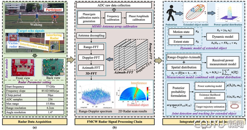 该成果聚焦解决多雷达非协作感知过程中,接收雷达回波信号受到攻击者发射信号射频干扰,导致幽灵目标和噪音大幅增加的问题,研究团队提出了一种新型的弱扩展目标联合抗干扰检测与跟踪系统,极大提升了弱目标的可检测性。为适应雷达散射点数目时变和扩展形态的空间时变性特性,系统利用自适应空间分布模型来捕捉感知轮廓随时间演变的动态信息。在此基础上,提出将所有后向散射点视为一个实体来匹配真实目标的新思路,避免了强干扰条件下目标检测、跟踪的可信关联难题。当前,该系统已在商用车载毫米波雷达平台上完成部署,验证了所提出方法的抗攻击有效性,其能够在遮挡、动态运动切换和多扩展目标等挑战场景中实现微弱扩展目标的高准确检测与高精度跟踪。
