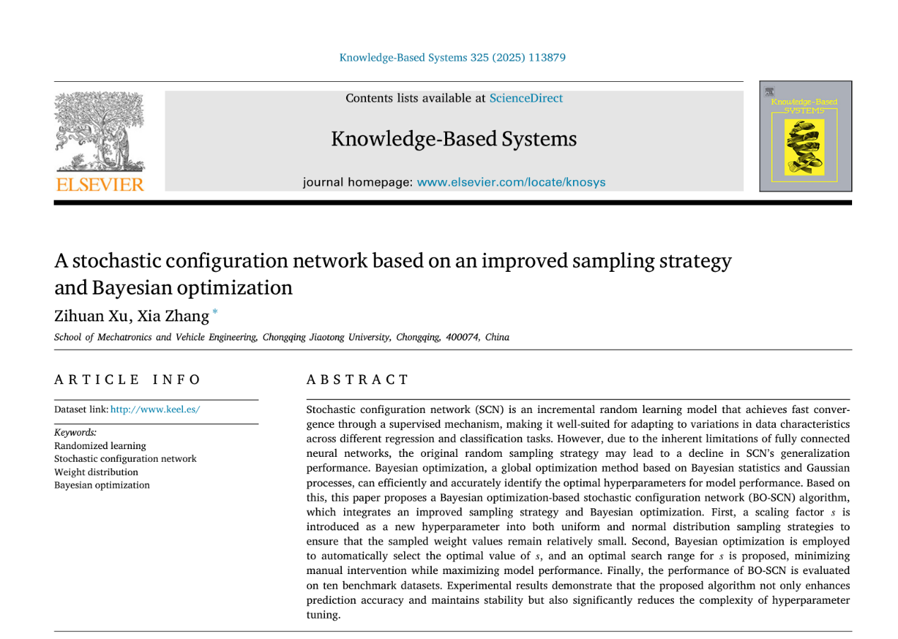 近日,老伟德网上娱乐机电与车辆工程学院硕士研究生徐梓桓(导师:张霞)在中科院一区Top期刊《Knowledge-Based Systems》上发表题为“A stochastic configuration network based on an improved sampling strategy and Bayesian optimization”的研究论文。论文提出的融合改进采样策略与贝叶斯优化的随机配置网络(SCN)算法,解决了传统SCN在处理复杂任务时模型性能下降和依赖人工调参的核心问题,突破了传统SCN在此类任务中的性能瓶颈。