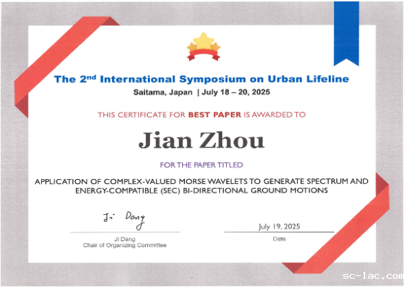 会议期间,我校曹一龙老师担任“Advances in Innovative Materials and AI-driven Design of Structures and Infrastructures”专题分会场主席,与参会同仁们进行了深入且富有成效的研讨。周建老师作了题为“Application of complex-valued Morse wavelets to generate spectrum and energy-compatible (SEC) bi-directional ground motions”的学术报告。报告革新了传统基于实数域的双向人工波反应谱匹配方法,提出了基于复数域小波变换的人工波合成方法,并引入Arias强度指标,进一步增强人工波与天然波的相似度,所提方法获得了与会专家、学者的高度认可。该成果还荣获《Urban Lifeline》期刊颁发的“2024年度最佳论文奖”,为我校在该领域赢得了国际声誉。
