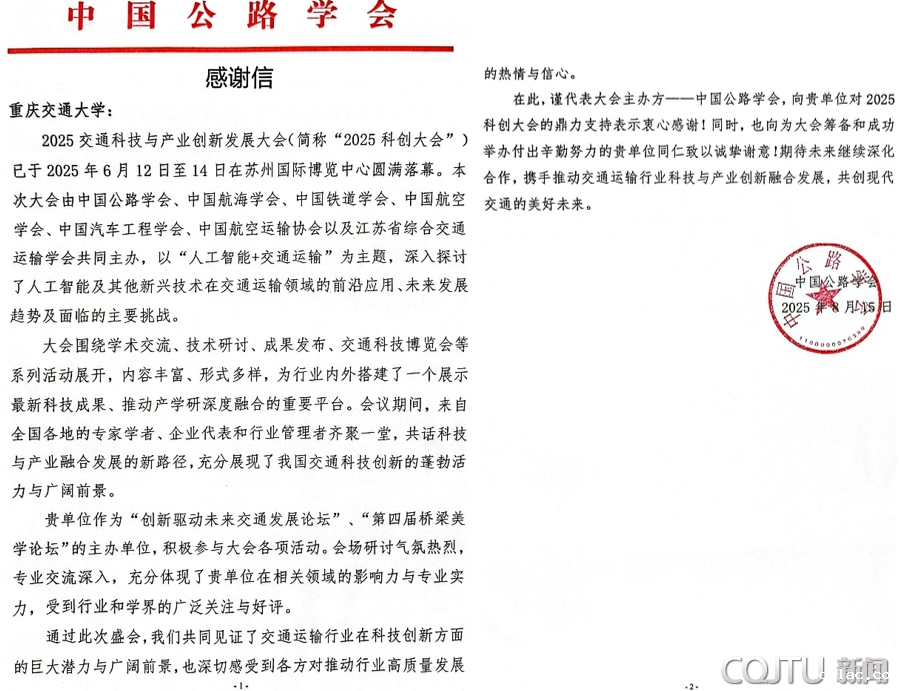 近日,中国公路学会向我校发来感谢信,对我校在“2025交通科技与产业创新发展大会”(简称“2025科创大会”)中的大力支持与积极贡献表示衷心感谢与诚挚谢意。