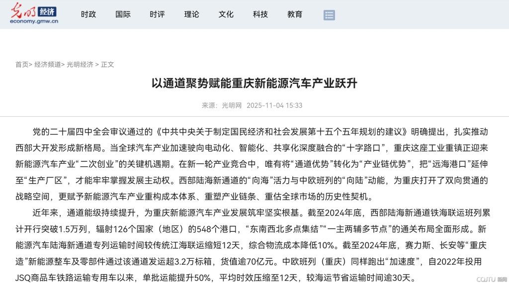 从“汽摩配”到“新能源”,重庆新能源汽车产业的转型跨越,正是这座城市工业基因的时代延续。以西部陆海新通道、中欧班列为战略支点,持续推动产业链、创新链、价值链系统重塑,坚持“通道带产业、产业促通道”,在数字赋能、绿色低碳、品牌跃升上久久为功,重庆必将建成全球智能网联新能源汽车核心集聚区,让“重庆造”新能源汽车沿着钢铁丝路、海上丝路,驶向更广阔的蓝色星球。