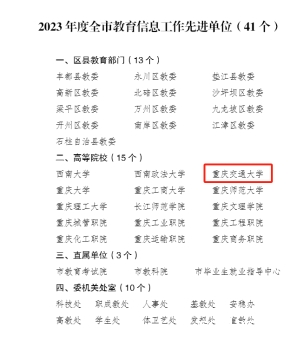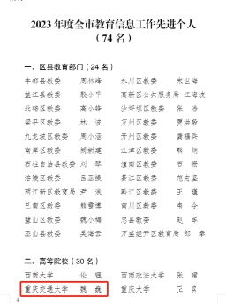 近日,中共重庆市委教育工委、重庆市教委印发《关于2023年度全市教育信息工作先进单位和先进个人的通报》,对信息工作先进单位和信息工作先进个人予以通报表扬。我校信息工作位列在渝高校第三,获评全市教育信息工作先进单位,魏巍同志评为全市教育信息工作先进个人。