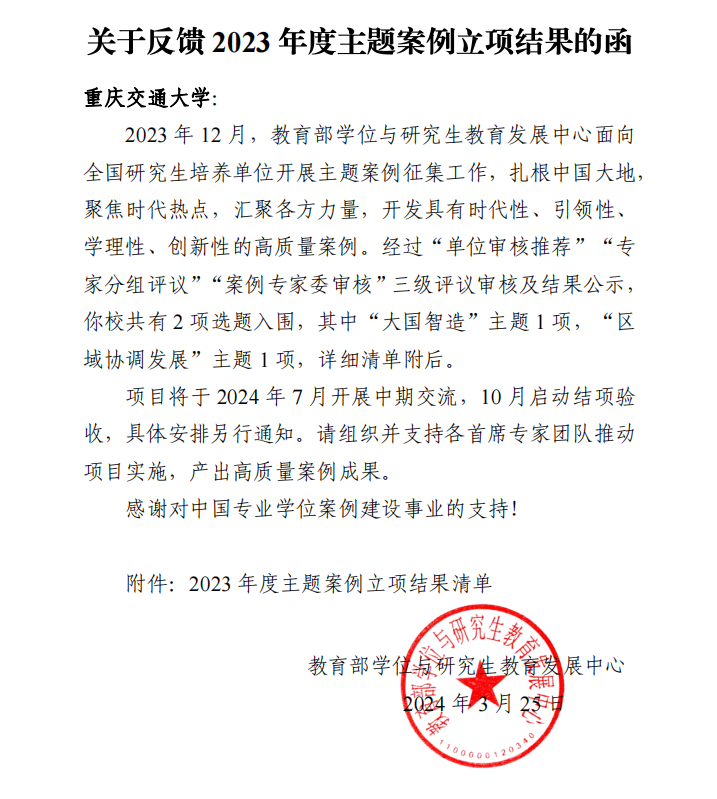 近日,据教育部学位与研究生教育发展中心《关于反馈2023年度主题案例立项结果的函》(学位中心函〔2024〕8号),老伟德网上娱乐两项获批立项教育部学位与研究生教育发展中心2023年度主题案例,详细清单如下: