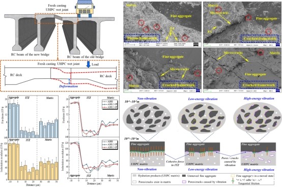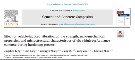 2024年3月,山区桥梁及隧道工程国家重点实验室桥梁性能提升研究团队2022级博士研究生冷景晨(指导教师:周建庭、邹杨、杨俊)在土木工程结构与建筑技术领域国际顶级期刊《Cement and Concrete Composites》(影响因子:10.5,工程领域期刊CiteScore排名:4/200)发表题为《Effect of vehicle-induced vibration on the strength, nano-mechanical properties, and microstructural characteristics of ultra-high-performance concrete during hardening process》的研究论文。