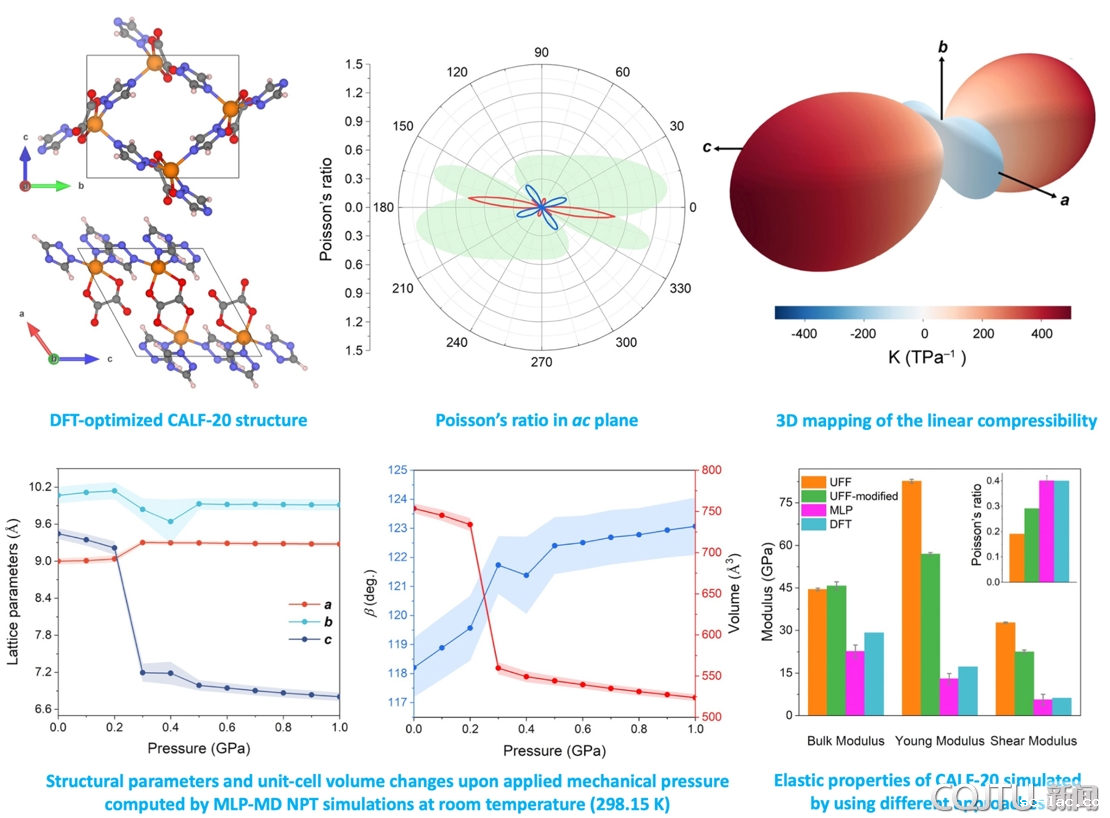 作为高效CO2捕集的吸附剂,Shimizu教授于2021年提出了一种名为CALF-20的金属有机框架(MOF)结构,其具有优异的CO2/N2分离性能,高水解稳定性和易于规模化量产的特性,使其成为首个工业应用的MOF结构。[Science 374, 1464,2021]然而,迄今为止,有关CALF-20结构本身的机械/热力学性能仍然存有争议。在此背景下,本文通过结合系统性的第一性原理计算和高精度机器学习势函数分子动力学模拟,对CALF-20的机械和热力学行为进行了原子尺度的探究。CALF-20对温度和压力刺激表现出独特的结构响应,导致负面积压缩和负热膨胀现象共存。因此除了在CO2捕获领域的实际应用优势之外,该材料对于机械/热传感领域也具有非常优异的应用前景。模拟结果表明,CALF-20在0 K和室温下单轴拉伸应变下均表现出异常应变软化现象,最终导致亚稳态结构的形成,同时该亚稳相与近期实验测试结构保持一致。[ACS Mater.Lett. 5, 2942,2023]本工作首次从理论角度对CALF-20结构的柔韧性进行了系统性的探究,明确了CALF-20结构的非刚性结构特征以及独特的机械/热力学响应。