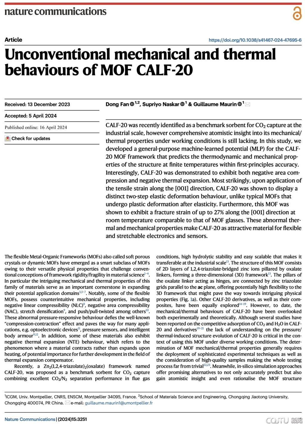 近期,材料科学与工程学院在国际期刊《Nature Communications》上发表了题为“Unconventional mechanical and thermal behaviours of MOF CALF-20”的科技论文。论文链接:https://doi.org/10.1038/s41467-024-47695-6。《Nature Communications》为Nature Portfolio旗下国际顶级综合性学术期刊,主要刊登自然科学领域最新的科研进展。论文的第一作者为材料科学与工程学院青年教师樊冬博士,通讯作者为法国国家研究中心Guillaume Maurin教授,老伟德网上娱乐材料科学与工程学院为共同完成单位。
