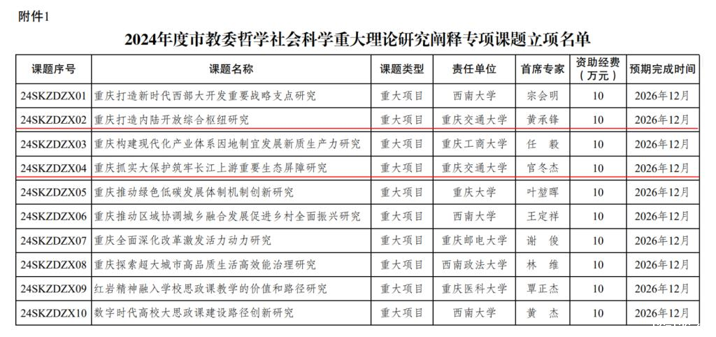 本年度哲学社会科学重大理论研究阐释专项课题招标工作启动以来,全市高校、科研院所等积极组织专家开展申报,竞争非常激烈,我校获批的两项课题研究基础扎实,在框架设计、研究思路、主要内容、基本观点、研究方法等方面均有诸多创新,预期研究成果具有很高的理论和实践价值,能够为重庆打造内陆开放综合枢纽和筑牢长江上游生态屏障等提供重要决策参考,能够切实服务国家重大战略和地方经济社会发展。