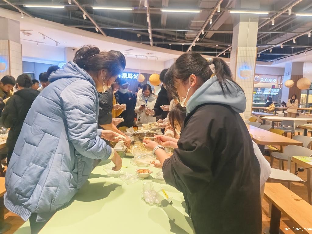在学校南岸校区生态食堂和科学城校区德园一食堂、礼园二食堂,后勤工作人员会同食堂阿姨们与同学们一块儿和面、一块儿包饺子,同学们积极参与,团聚在一起,用休息时间挽起袖子,动手包出“元宝”一样的饺子,寓意着红红火火、诸事顺心。