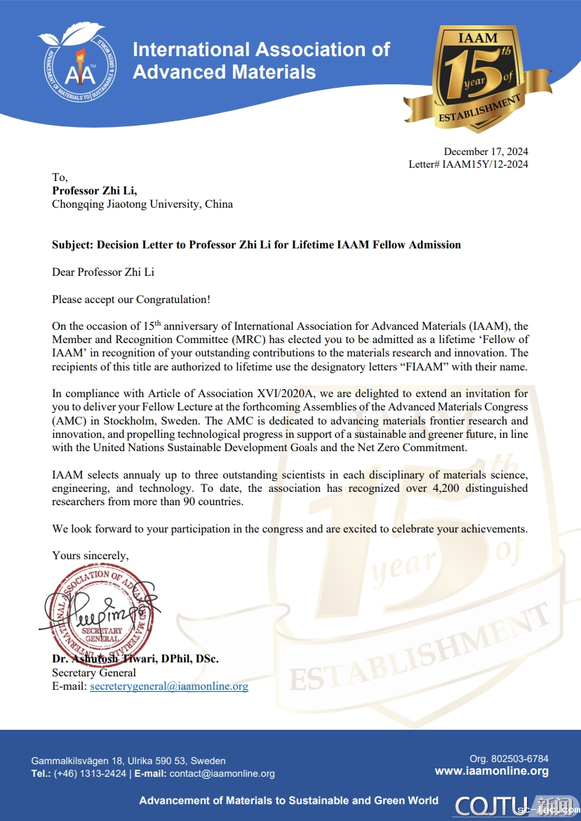 近日,国际先进材料协会(International Association of Advanced Materials,IAAM)发来贺信,祝贺我校材料科学与工程学院李志副教授当选为IAAM会士(Lifetime IAAM Fellow),以表彰他在材料研究和创新领域所做出的突出贡献。