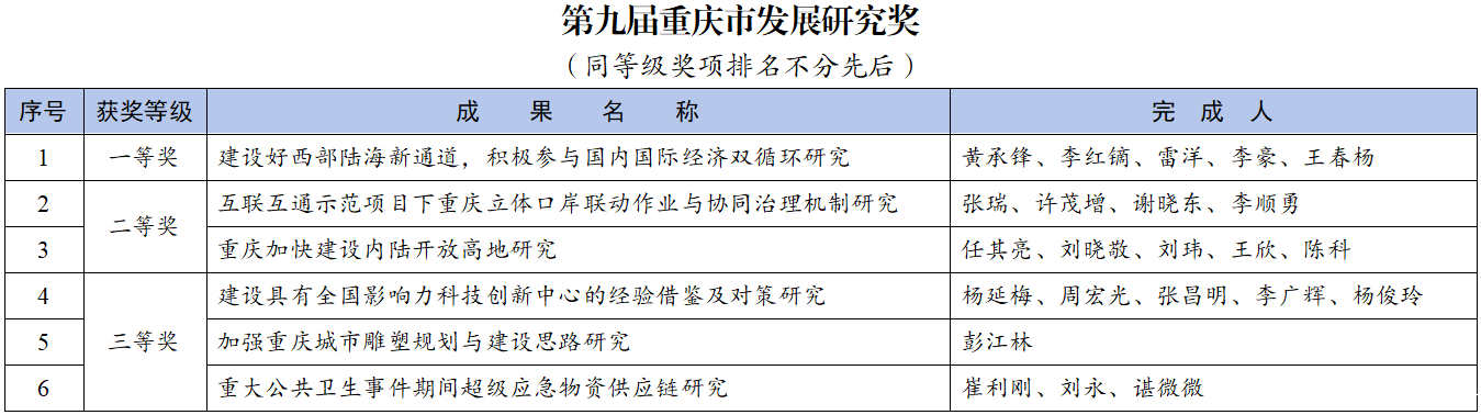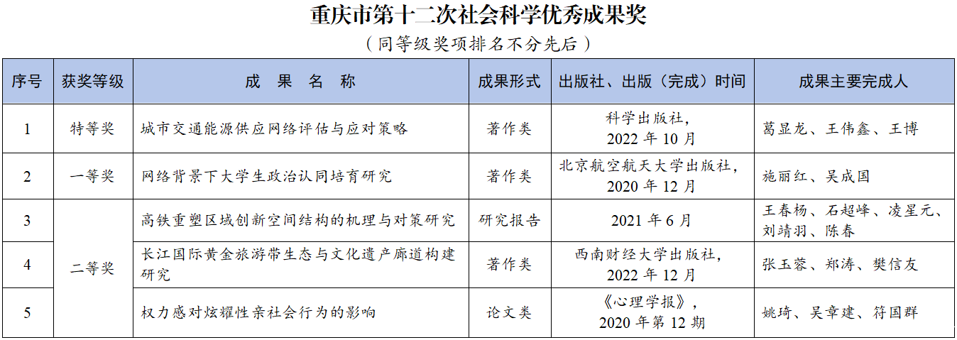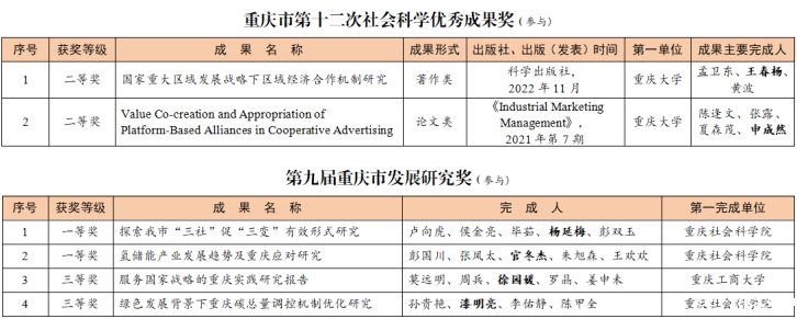 同时,在本次成果奖评选中,我校教师参与申报的成果获得重庆市第十二次社会科学优秀成果二等奖2项;获得第九届重庆市发展研究奖4项,其中一等奖2项、三等奖2项。