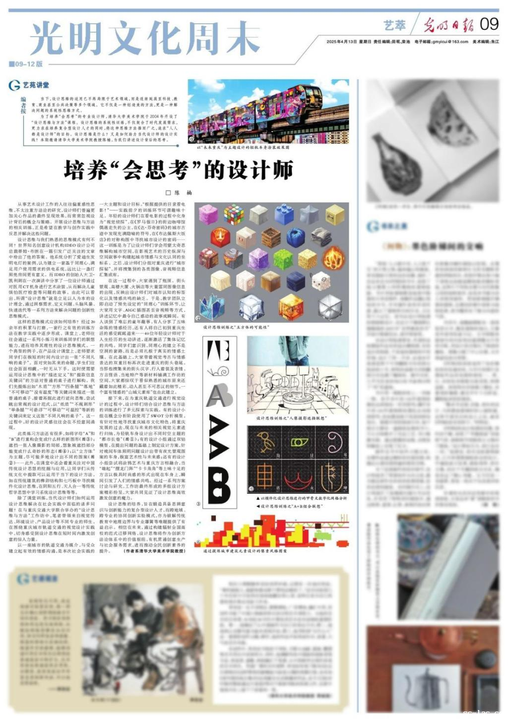 近日,我校特聘教授陈楠在《光明日报》美术版“艺苑讲堂”栏目发表了署名文章《培养“会思考”的设计师》,这是该新增栏目的首篇文章,详细分享了由陈楠教授指导的我校艺术设计学院实验班“设计思维与方法”工作坊教学实践。