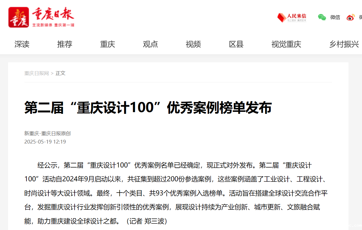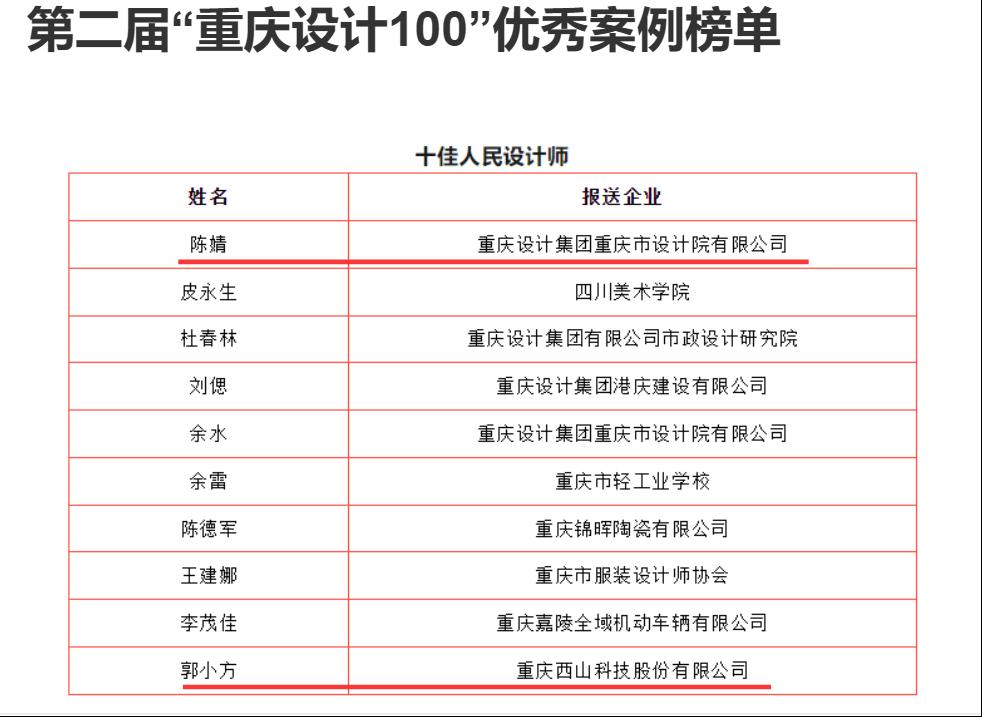 近日,在重庆市加快建设“设计之都”的战略浪潮中,由重庆日报报业集团主办的第二届“重庆设计100”评选活动圆满落幕,入选名单正式揭晓。艺术设计学院再传喜讯,2006级环境设计专业陈婧与2013级工业设计专业郭小方两位校友凭借卓越的设计才华与深厚的人民情怀,从众多参评者中脱颖而出,荣膺“十佳人民设计师”称号,为我校设计教育成效再添浓墨重彩的一笔。