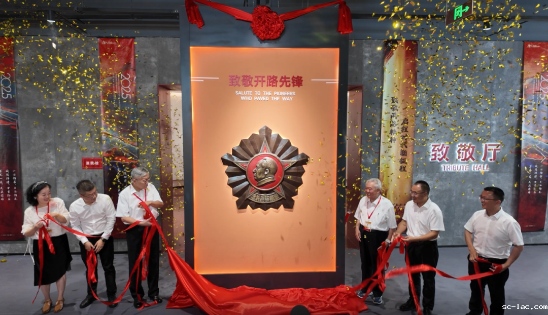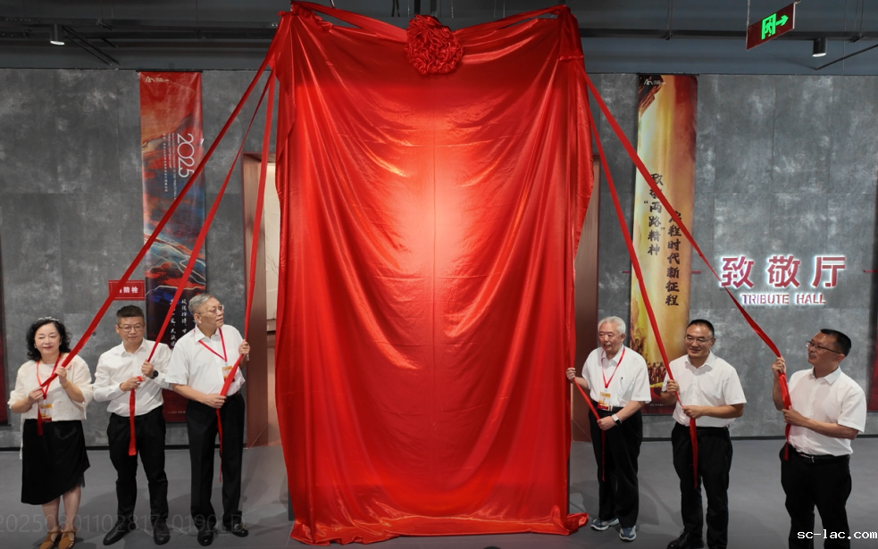 在充满敬意的氛围中,与会主要领导共同为“康藏天路·精神永续”致敬厅揭幕。红绸落下,光芒映现,金色彩带与庄严的徽章墙熠熠生辉。