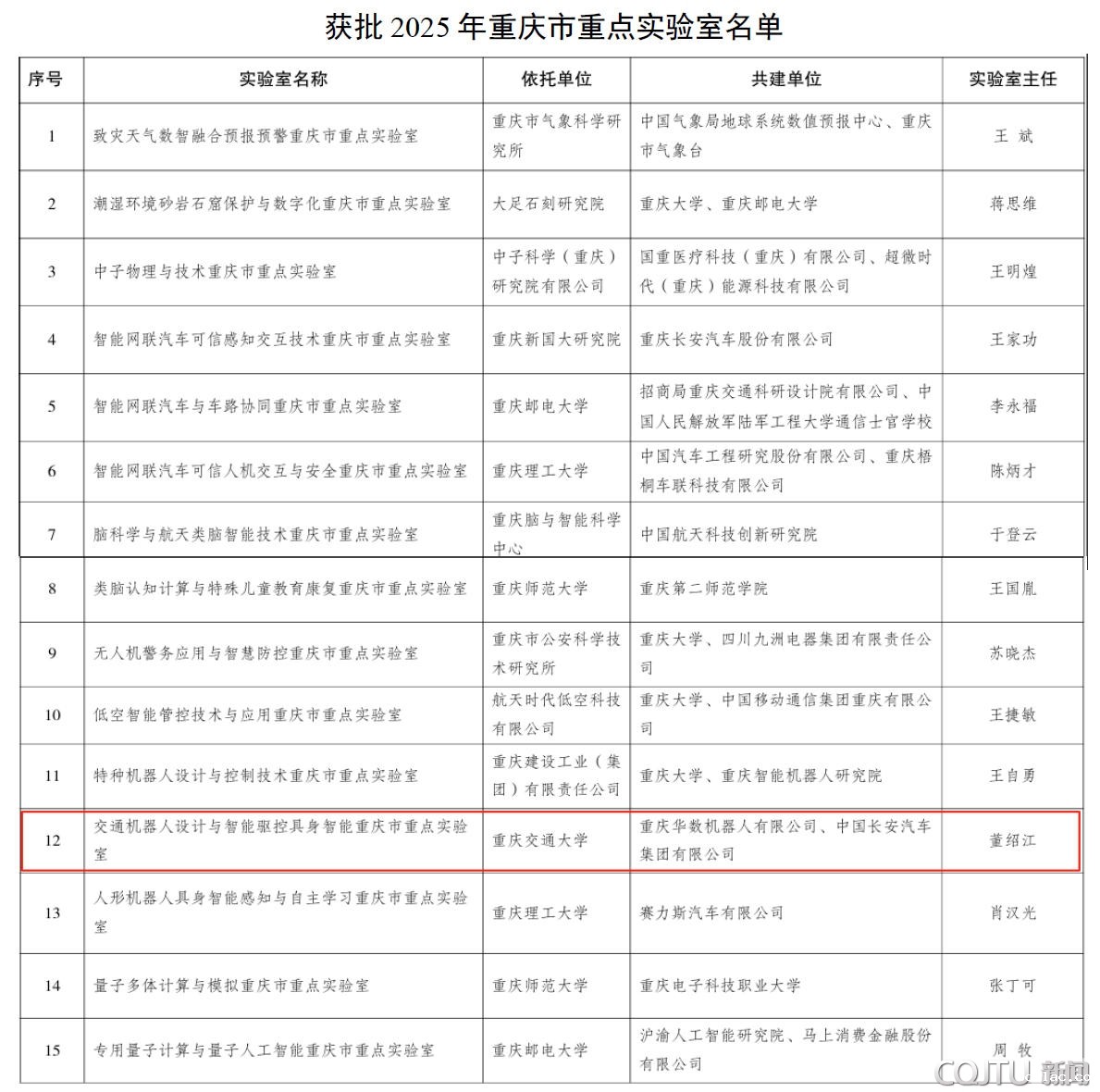 按照《重庆市实验室建设与运行管理办法》(渝科局发〔2023〕54号)和年度工作安排,重庆市科技局已组织开展了2025年重庆市重点实验室申报和评审工作。近日,市科技局公布了获批重庆市重点实验室名单(全市共有15个),其中,我校“交通机器人设计与智能驱控具身智能重庆市重点实验室”在列。