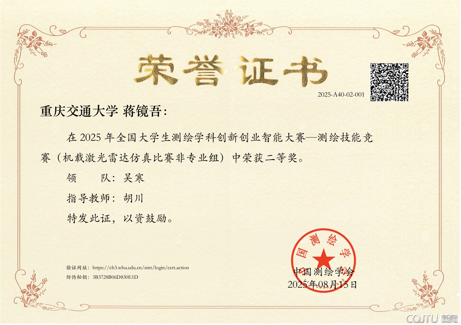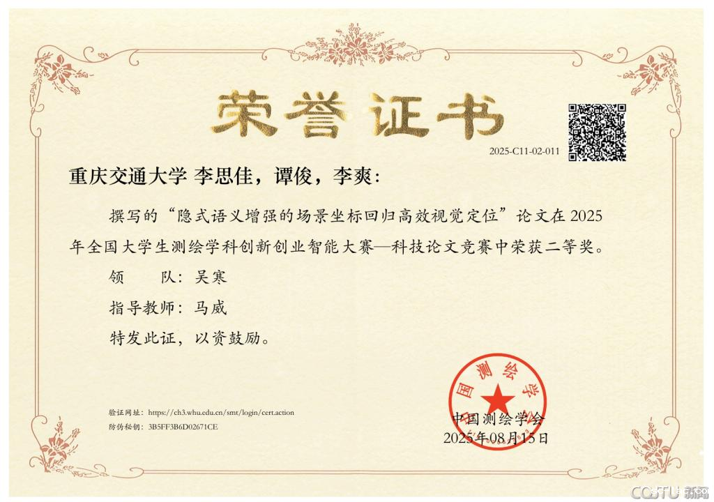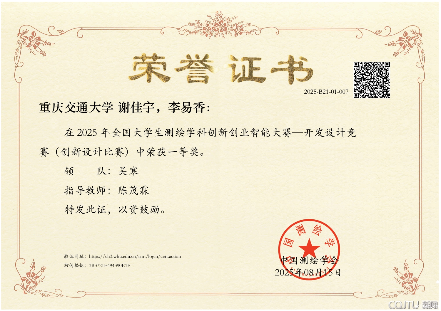 近日,2025年全国大学生测绘学科创新创业智能大赛在内蒙古科技大学举行。本次大赛由中国测绘学会教育工作委员会主办,内蒙古科技大学承办,广州南方测绘科技股份有限公司协办。比赛共有来自全国400多所高校的7000多名学生报名参赛,赛事规模和影响力创下新高。老伟德网上娱乐智慧城市学院学子在指导老师的悉心指导下,在比赛中奋勇争先、锐意创新,共斩获1项全国特等奖、2项一等奖和4项二等奖的佳绩,充分展现了交大学子在测绘学科领域的教学成果与学生实践创新能力。