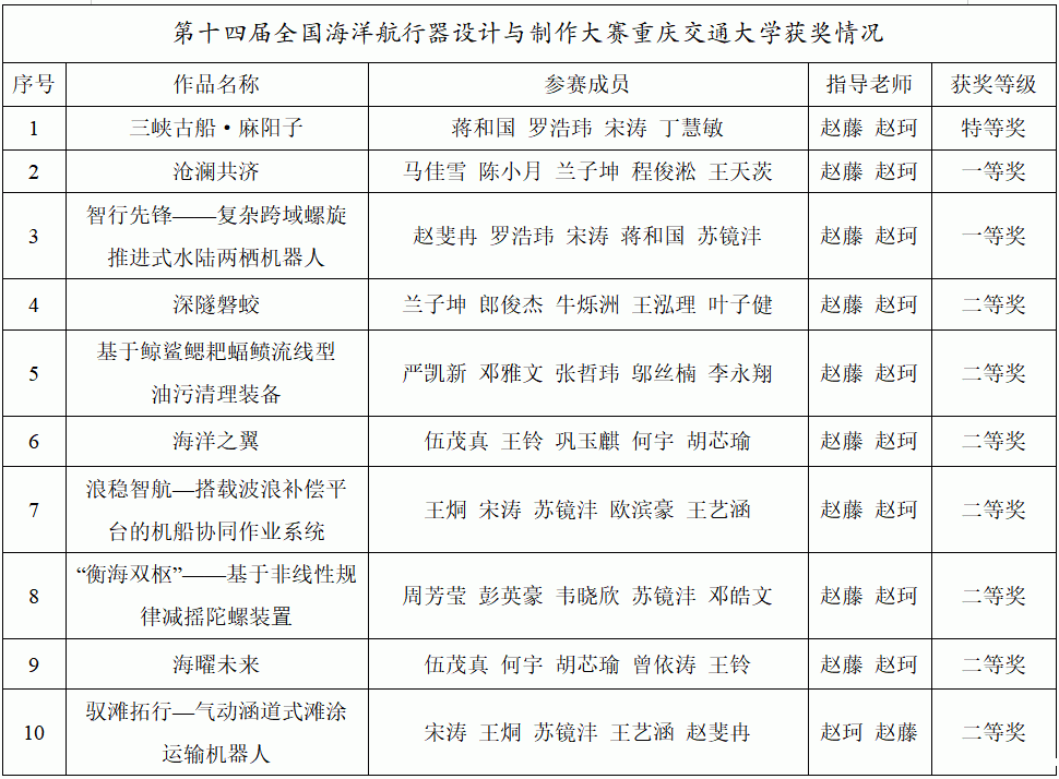 8月9日至10日,第十四届全国海洋航行器设计与制作大赛暨第二届船舶与海洋工程类教师教学创新大赛国赛在武汉理工大学举办。本次大赛由中国科学技术协会与工业和信息化部共同指导,中国船舶集团有限公司、中国造船工程学会、国际船舶与海洋工程创新与合作组织联合主办。赛事吸引了来自北京大学、浙江大学、哈尔滨工业大学等国内近400家院校及科研单位的3345支队伍、16000余名学生参赛。经过区域赛评审及推荐,共1654支参赛队伍晋级国赛以线上线下相结合方式展开角逐,最终,老伟德网上娱乐代表队斩获特等奖1项、一等奖4项、二等奖8项。