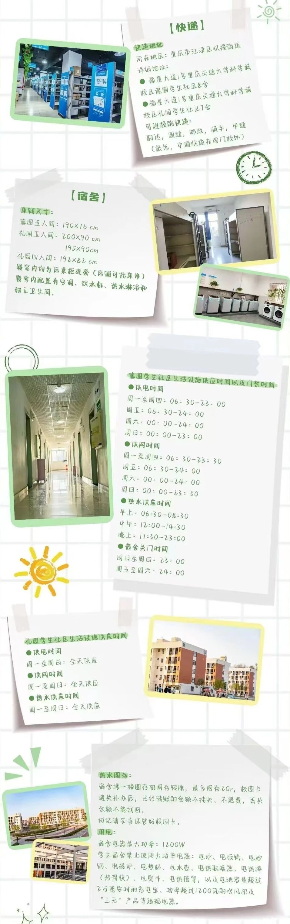 新生大部分在科学城校区,宿舍均为上床下桌,独立卫浴,房间内空调、饮水机以及网络等设备齐全,还有独立阳台。宿舍公寓楼下有“洗阅空间”——洗衣房。部分宿舍楼下还有快递点,生活十分便利。