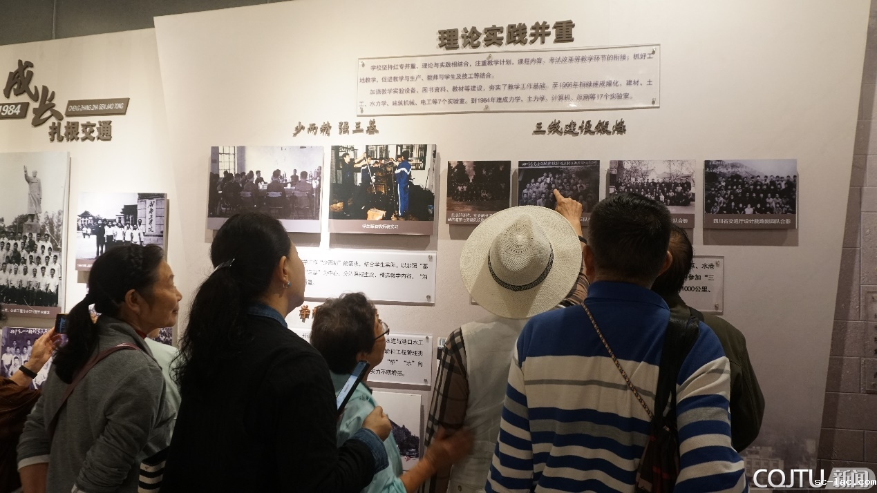 移步至校史馆,一张合照突然吸引了校友们的目光,大家纷纷驻足,脚步不自觉地围拢过去。“这不是我们当年的毕业照吗?怎么会在这里!”人群中有人率先惊呼,语气里满是意外与欣喜。有的校友眯起眼睛,手指在照片上缓缓移动,仔细辨认着熟悉的面孔:“我记得我当时站在第三排,左边是班长,右边是隔壁宿舍的小李!”。有的则互相指点提醒,“你快看那边角落,是不是你?那时候你还留着短发呢……”大家你一言我一语,在泛黄的影像里找寻着年轻时的模样,那些藏在时光里的青春记忆,也随着讨论慢慢鲜活起来。展厅内一幅幅记录校园生活的老照片、一件件承载历史的实物展品、一段段讲述学校发展的文字资料,既定格了一代代交大人的青春岁月,更见证了学校从建校初期克服资源匮乏、条件简陋的筚路蓝缕,到如今桃李满天下、深耕交通领域的蓬勃发展。母校的每一步前行,既是对“明德行远,交通天下” 校训的坚定践行,更与 “两路” 精神深度契合。