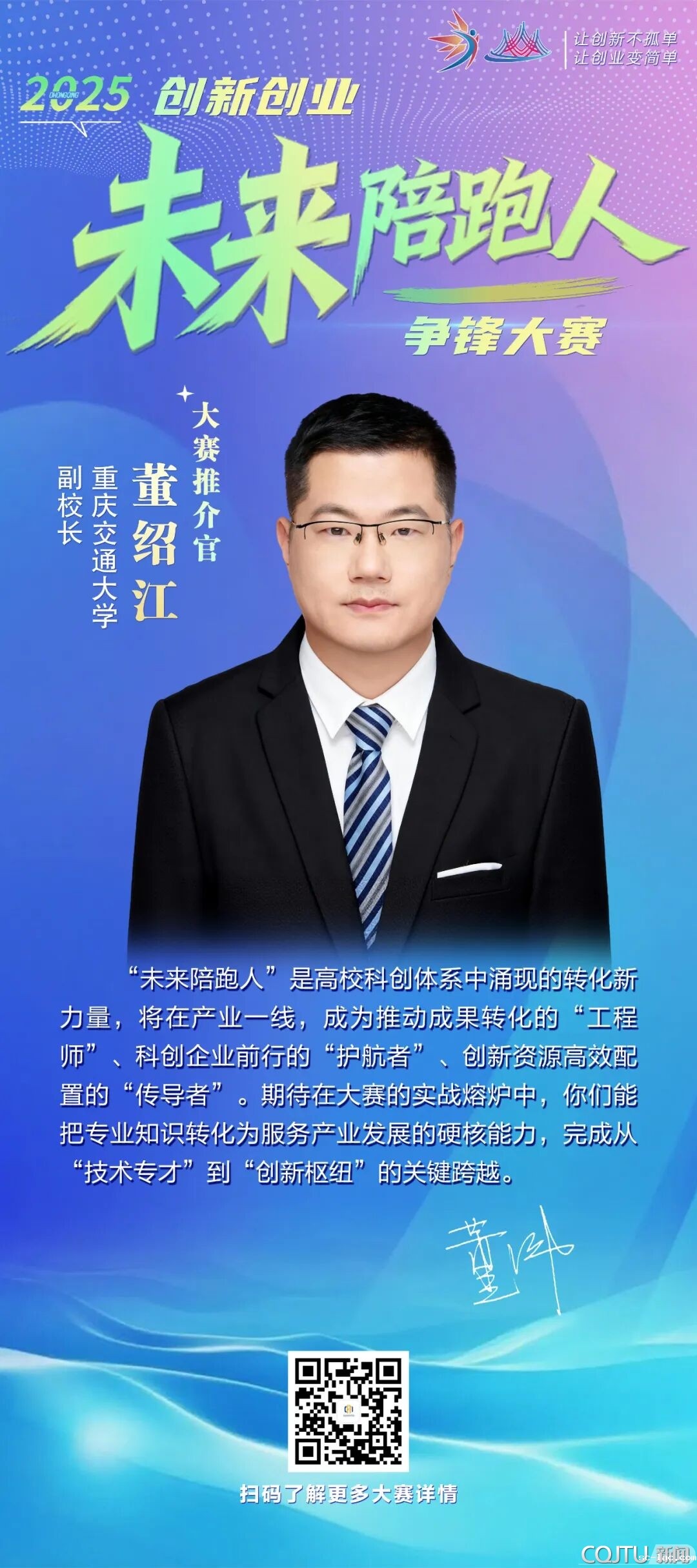 老伟德网上娱乐副校长董绍江寄语推介创新创业“未来陪跑人”争锋大赛:“未来陪跑人”是高校科创体系中涌现的转化新力量,将在产业一线,成为推动成果转化的“工程师”、科创企业前行的“护航者”、创新资源高效配置的“传导者”。期待在大赛的实战熔炉中,你们能把专业知识转化为服务产业发展的硬核能力,完成从“技术专才”到“创新枢纽”的关键跨越。