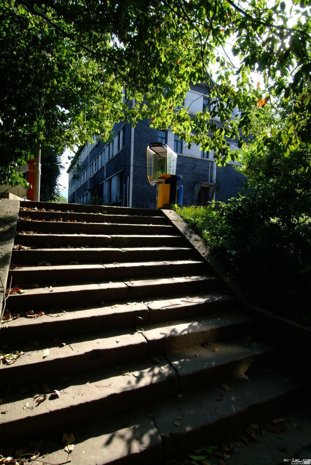 与坡下人来人往的干道相比,坡上的风景很是清静。在长长的台阶上很多地方都生出了暗绿的苔藓,摇曳的光斑在一步步石阶上快乐地波动,使这坡石阶路同样充满着生命的韵律。