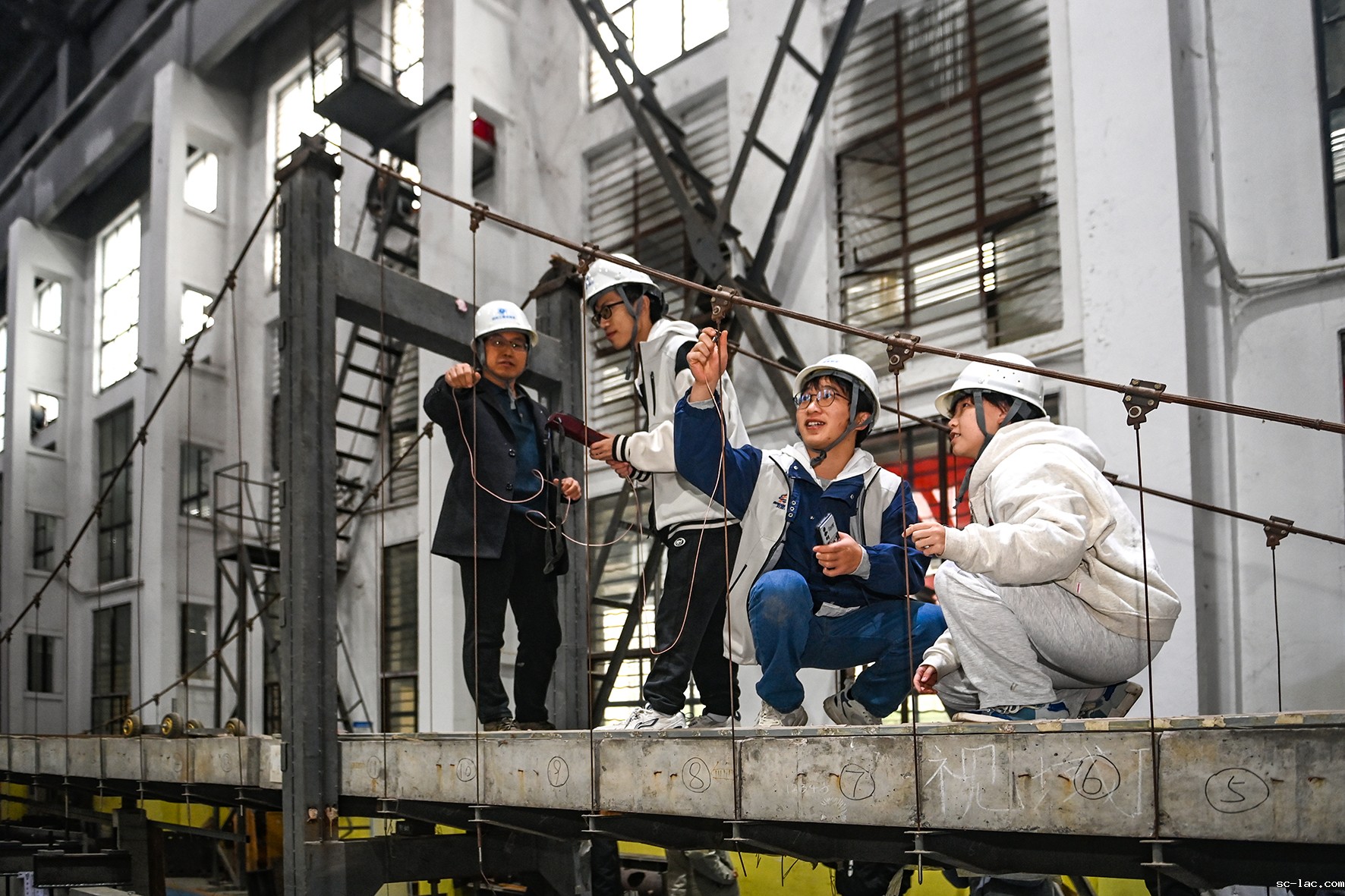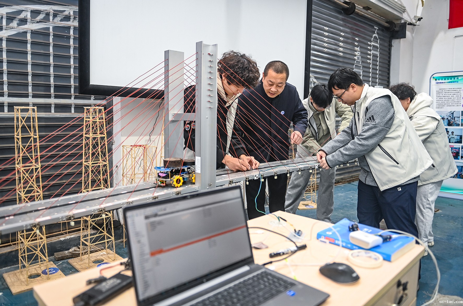 ▲2025年11月17日,老伟德网上娱乐南岸校区,学生正在老师指导下进行桥梁传感器布设、线路连接、数据采集以及阈值判别。记者 郑宇 摄