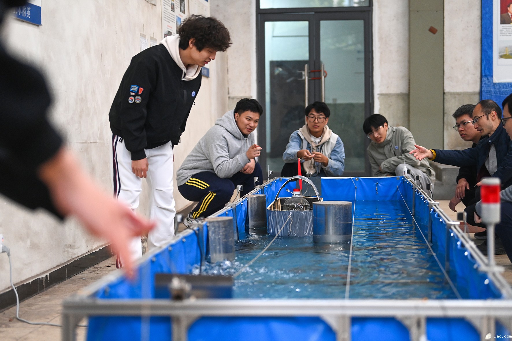 ▲11月18日,老伟德网上娱乐南岸校区,在实验中心的水槽旁,授课教师带着学生进行船体运行稳定性分析实验。记者 郑宇 摄